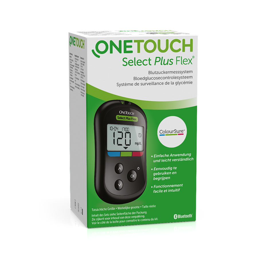 Scope of delivery: OneTouch Select Plus Flex® blood glucose meter (battery type CR2032 included), OneTouch® Delica® Plus lancing device, 10 sterile OneTouch® Delica® Plus lancets, 10 OneTouch Select® Plus test strips, instructions for use, quick guide and case