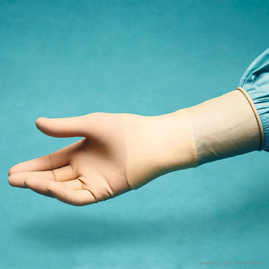 Powder-free diposable surgical gloves made of ultrathin and soft latex, with an inner polymer lining for easy donning and micro roughened to provide an optimum safe grip, rolled edge, anatomical fit, sealed in pairs