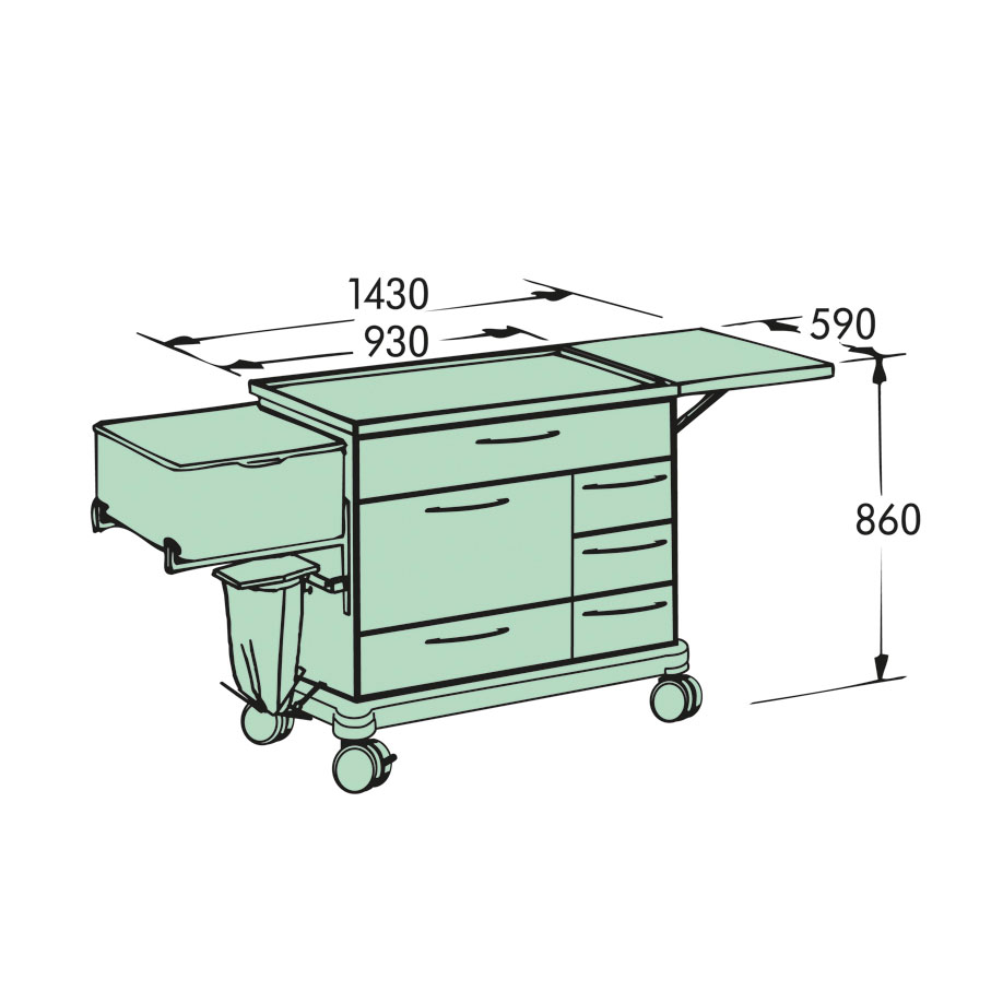 Cabinet body with 1 drawer Type 9D with subdividers for plaster dressing, left 1 drawer Type 6G and 1 drawer Type 6D, on the right, 3 drawers Type 3D, incl. on the left plastic basin 202.0007.0 525 x 455 x 220 mm (W x D x H) with holder, swivel-type waste bag holder 202.0008.0 with 1 roll of waste bags (48 pcs), right shelf 202.0056.0 made of 18/10 stainless steel.