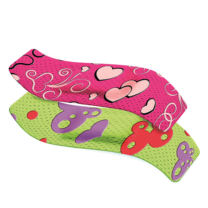 Brethable, coloured plaster in non-woven material with fun“3D“ design. Two desings in each pack. Hypoallergenic adhesive, solvent free and without natural rubber latex.