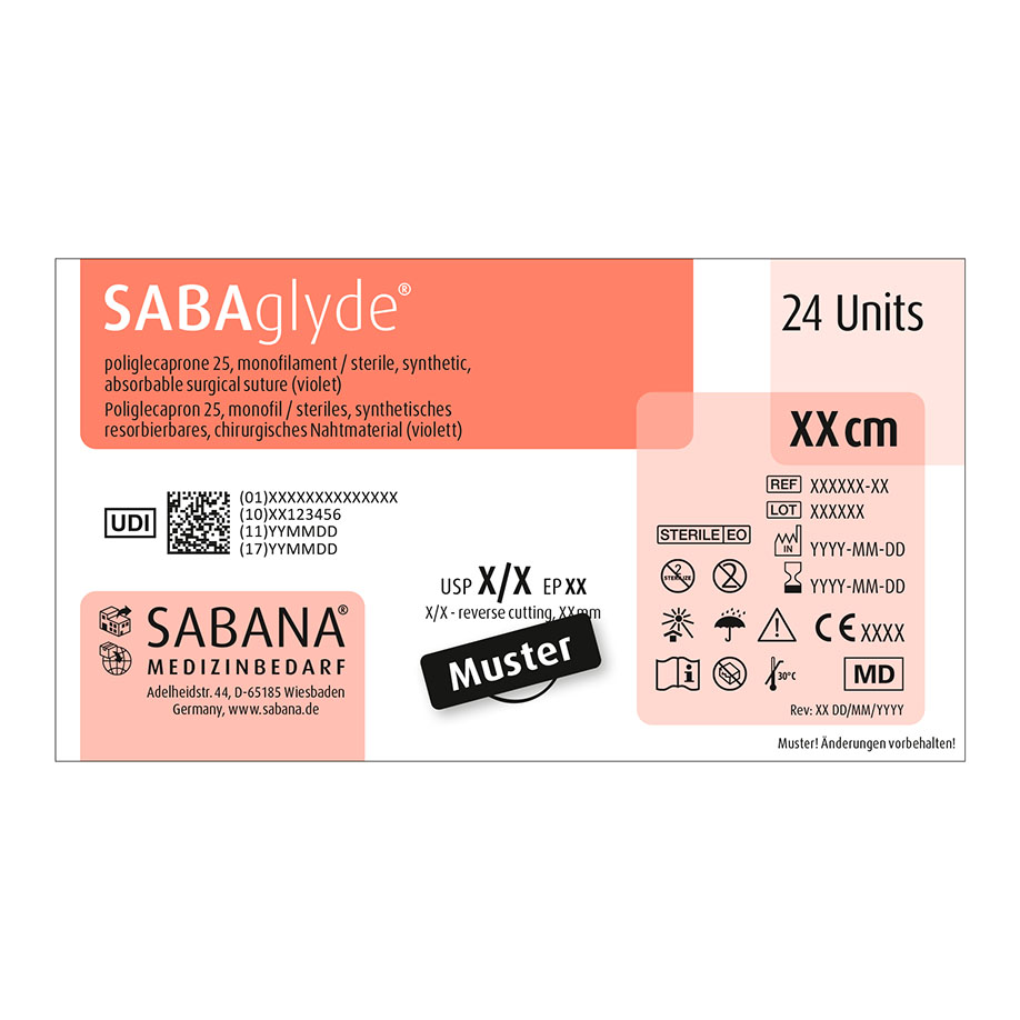 SABAglyde® suture material (polyglecaprone-25) is a sterile synthetic monofilament absorbable surgical suture material made from a copolymer of glycolide and E-caprolactone. Its absorption is essentially complete after 90 days. Tensile strength: medium term. Dissolution time: 60-90 days.