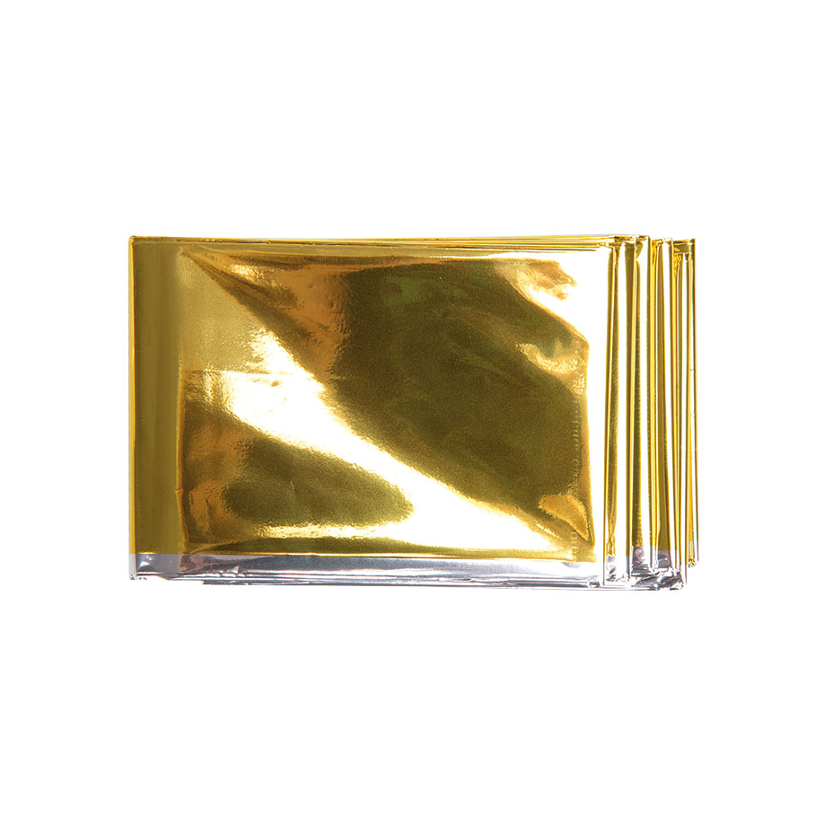 The sheet reflects up to 85% of body warmth, prevents hypothermia and rapid decreases in body temperature.It has an excellent signalling effect and the gold side can be clearly seen in darkness. Contained within the German DIN 13157 and DIN 13 169 fillings. Also for automobile kits, in accordance with DIN 13164.