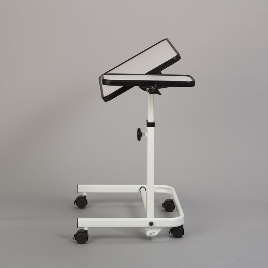 Extended model with tiltable column and U-shaped base. The entire column can be tilted up to 80° according to the patient's wishes or spatial conditions. The base can easily be slid under a bed so that the patient has the entire table top in front of him/her. The table top can be tilted and adjusted horizontally or at an angle in 9 steps. By fixing the table top in predefined holes, it is better fixed and more stable. The table top also has a raised border that gives objects a secure hold from falling down. The height of the table can be adjusted continuously, the table is mobile and lockable due to 4 castors, which are all equipped with brake knobs.