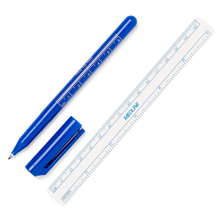 Sterile surgical skin markers for marking on intact skin. The product is supplied with a 15 cm ruler for precise measurement. A ruler is also printed on the pen.