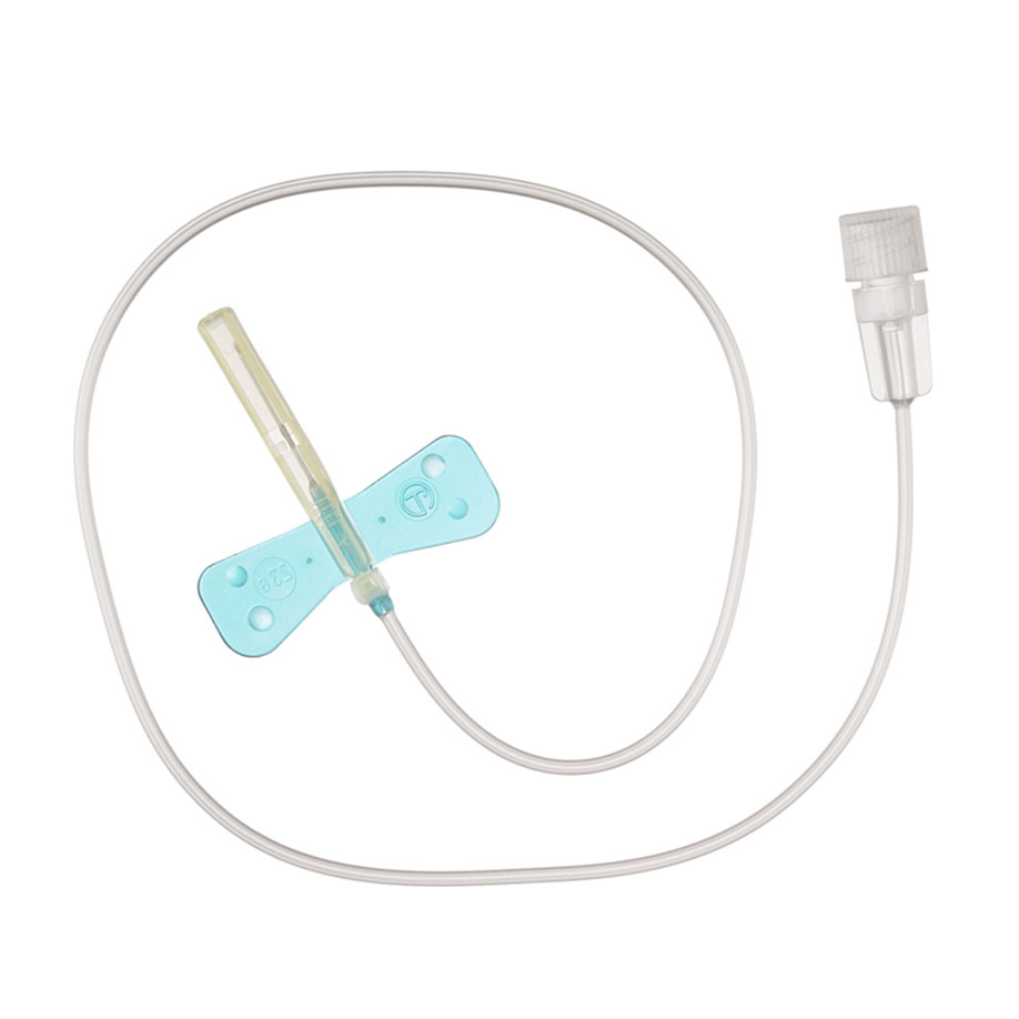 Wing cannula with protective cover. The needle guard is activated by pressing with the thumb and index finger at the base of the wing - the fingers remain behind the cannula. An audible click of the needle protector and a visual check through the inspection window immediately show that the protector has irreversibly wrapped itself around the cannula. Individually sterile sealed, with 30 cm long, highly flexible, kink-resistant tubing. Latex-free