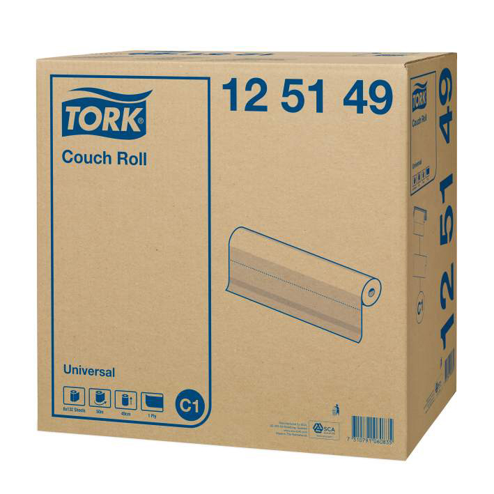 bright white couch cover, 1-ply, heavy crepe quality, measurements 49 x 28 cm, perforated, 8 rolls a 50 m (1.428 cloths) in carton