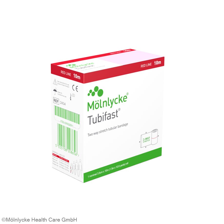Tubifast® 2-Way Stretch is an elastic tubular bandage that can be stretched both lengthwise and crosswise and is suitable for covering and securing primary bandages, such as Mepilex®, Mepilex® Lite, Mextra® Superabsorbent or other medical products.