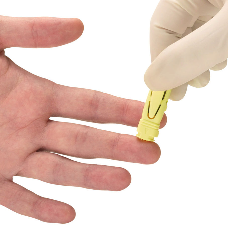 Unistik 3 is pre-set and ready for use. Just twist off the protective sterile cap and take the sample.The Unistik 3 needle point is hidden before use and automatically retracts after use to avoid accidental needlestick injuries and cross infection. insertion depth: 1,8 mm.