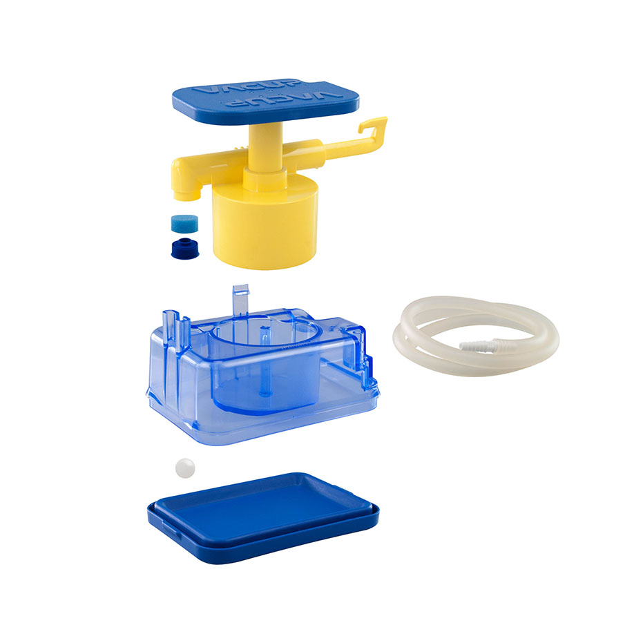 Energy-independent, maintenance-free suction pump developed for daily use for the suction of larger accumulations of blood, mucus, saliva etc., as well as thick and solid food particles. Foot suction incl. suction vessel 650 ml with overflow protection, 1300 mm suction hose (Ø 8 mm) and fingertip, weight: 850 g, max. vacuum: -82 Kpa, -615 mmHg, -0.82 bar, autoclavable up to 121 °C, dimensions (LxWxH): 180 x 130 x 110 mm