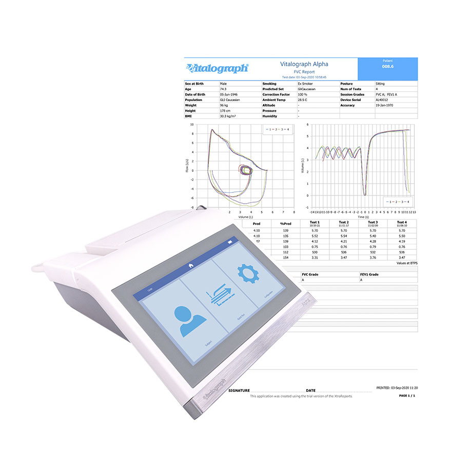 Vitalograph ALPHA Connect All-in-One spirometer with thermal printer touch screen with cable-free connection to the medical practice software via Connect Software