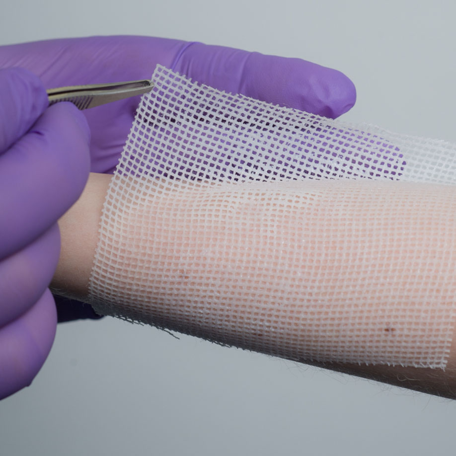 idra®care Garza sterile impregnated mesh gauze with a mixture of glycerine and 0.1 % hyaluronic acid. Does not stick to the wound. Suitable for burns up to and including 2nd degree, pressure ulcers, chronic wounds, surgical wounds, abrasions and cuts. The hyaluron and glycerine bind fluid, keep the wound moist, promote healing in wounds of all exudation phases and dry wounds.